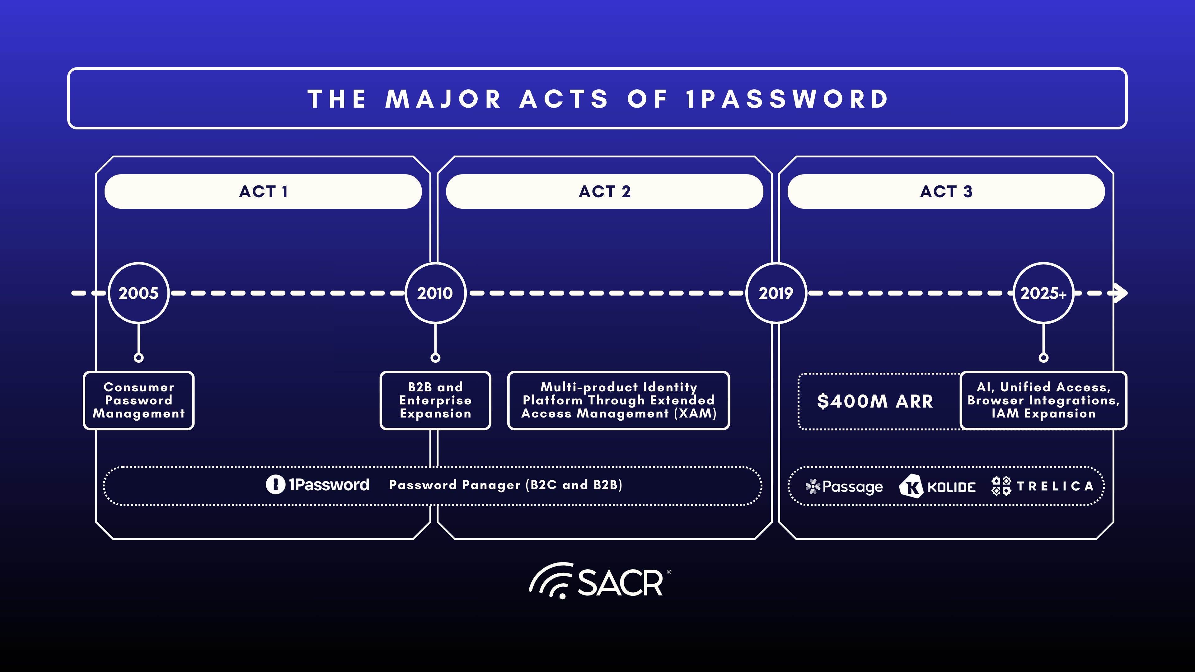 Act 2: This phase reflected a broader response to the growing complexity of digital identity. Through its Extended Access Management (XAM) strategy, 1Password began unifying password management, device trust, SaaS management, and passwordless authentication. Acquisitions including Kolide, Trelica, and Passage formed the technical foundation of this integrated identity platform.