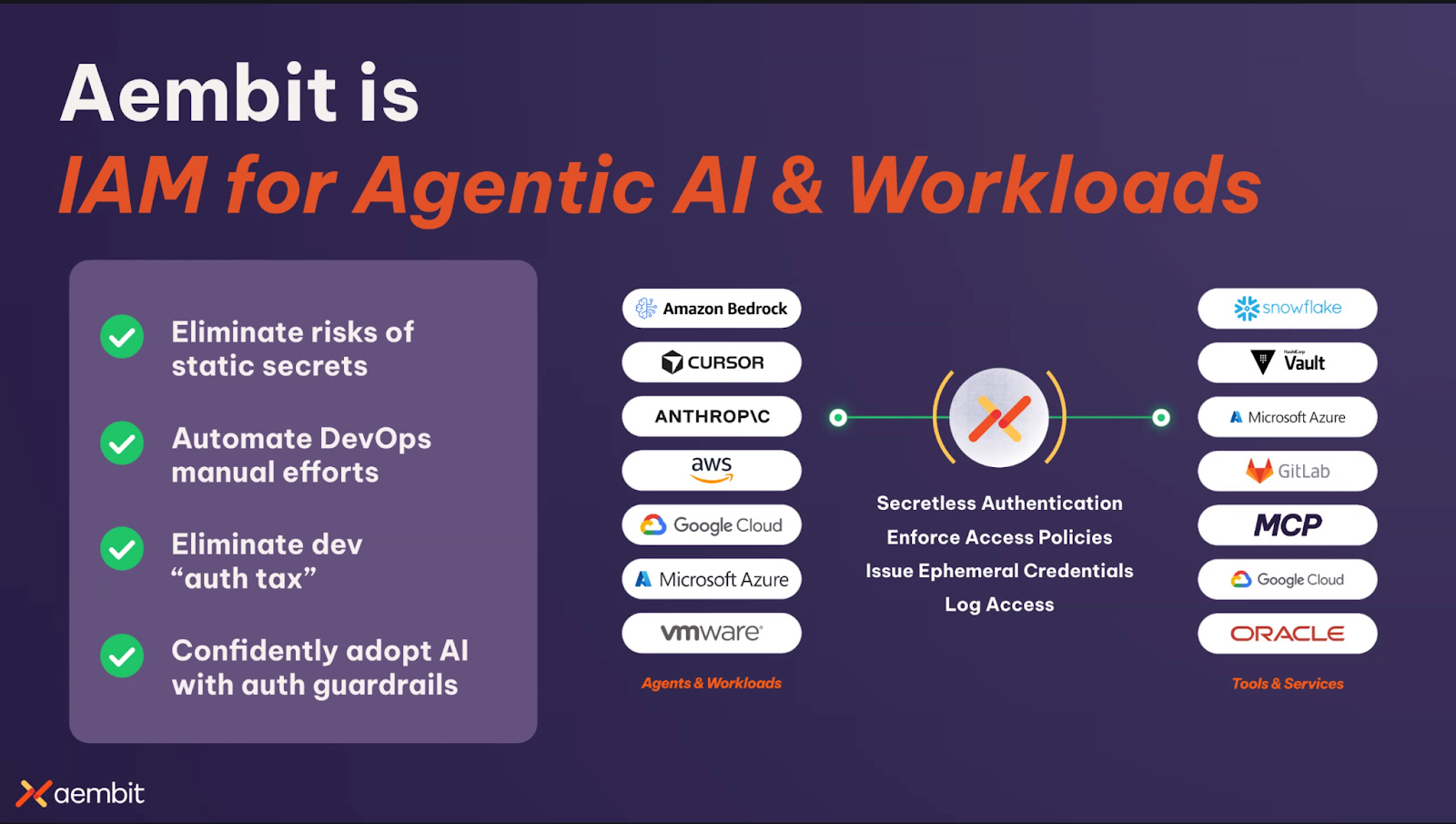 Overview: Aembit approaches agent security as a runtime identity and access-control problem. Its core model is built around replacing static credentials with identity-based, policy-driven access in which applications, workloads, and agents receive short-lived credentials at runtime rather than storing secrets directly. In this architecture, the agent does not need to manage or retain the credential itself; Aembit verifies identity, evaluates policy, brokers the appropriate access, and centralizes the resulting audit trail. The platform is therefore best understood as a runtime enforcement layer for non-human identity (NHI) access across workloads, services, and agentic systems.