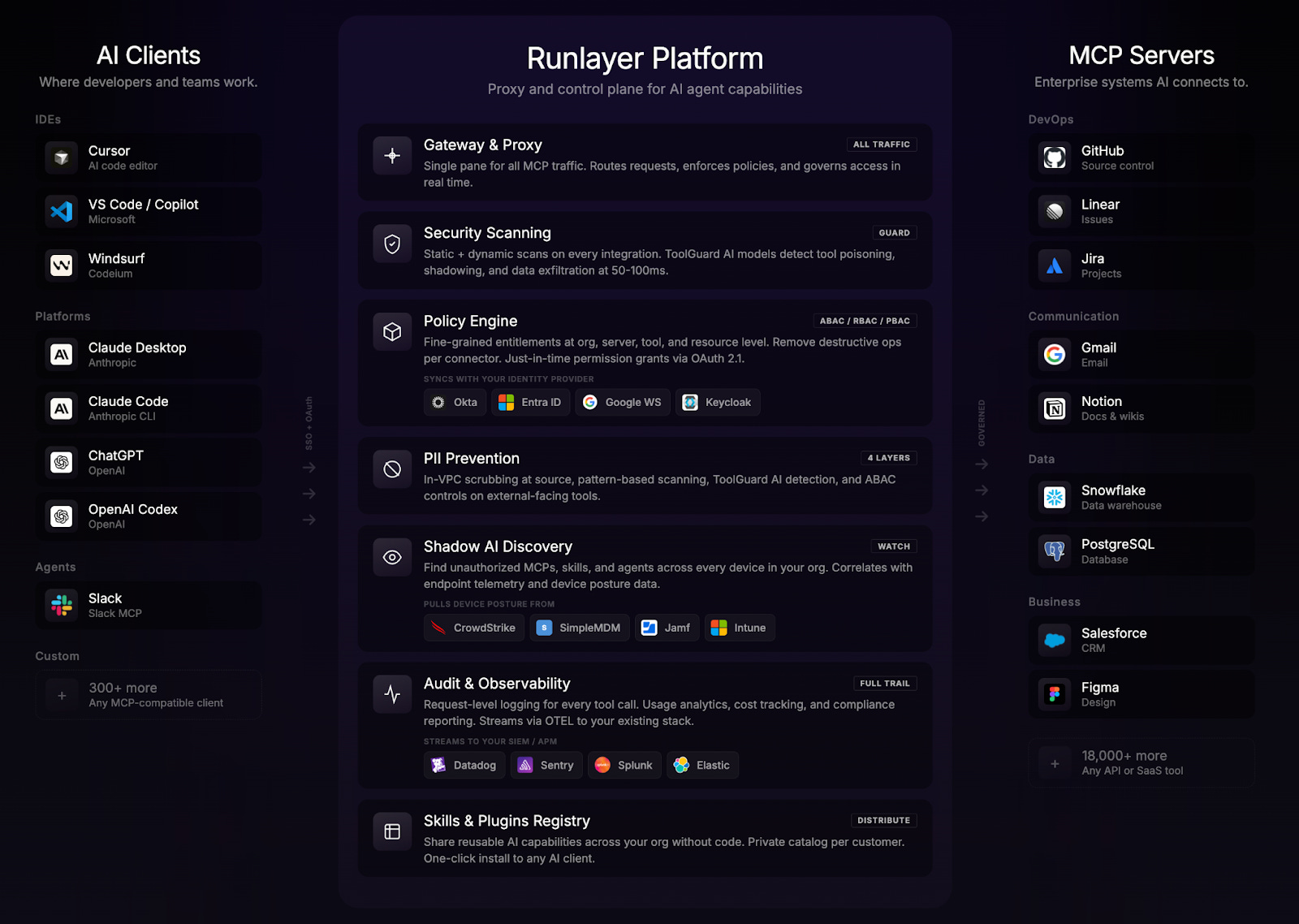 Overview: Runlayer positions itself as the control plane for AI agent infrastructure, providing runtime security, governance, and observability across every AI integration in the enterprise. The platform connects 300+ AI clients (Claude, Cursor, ChatGPT, VS Code, OpenAI Codex) to 18,000+ enterprise tools, with every connection secured by a three-layer security architecture: static and dynamic scanning at the perimeter, AI-powered runtime threat detection at inference time, and deterministic policy enforcement for access control. Runlayer is backed by Khosla Ventures and Felicis, with David Soria Parra, co-creator of MCP at Anthropic, as a close technical advisor.