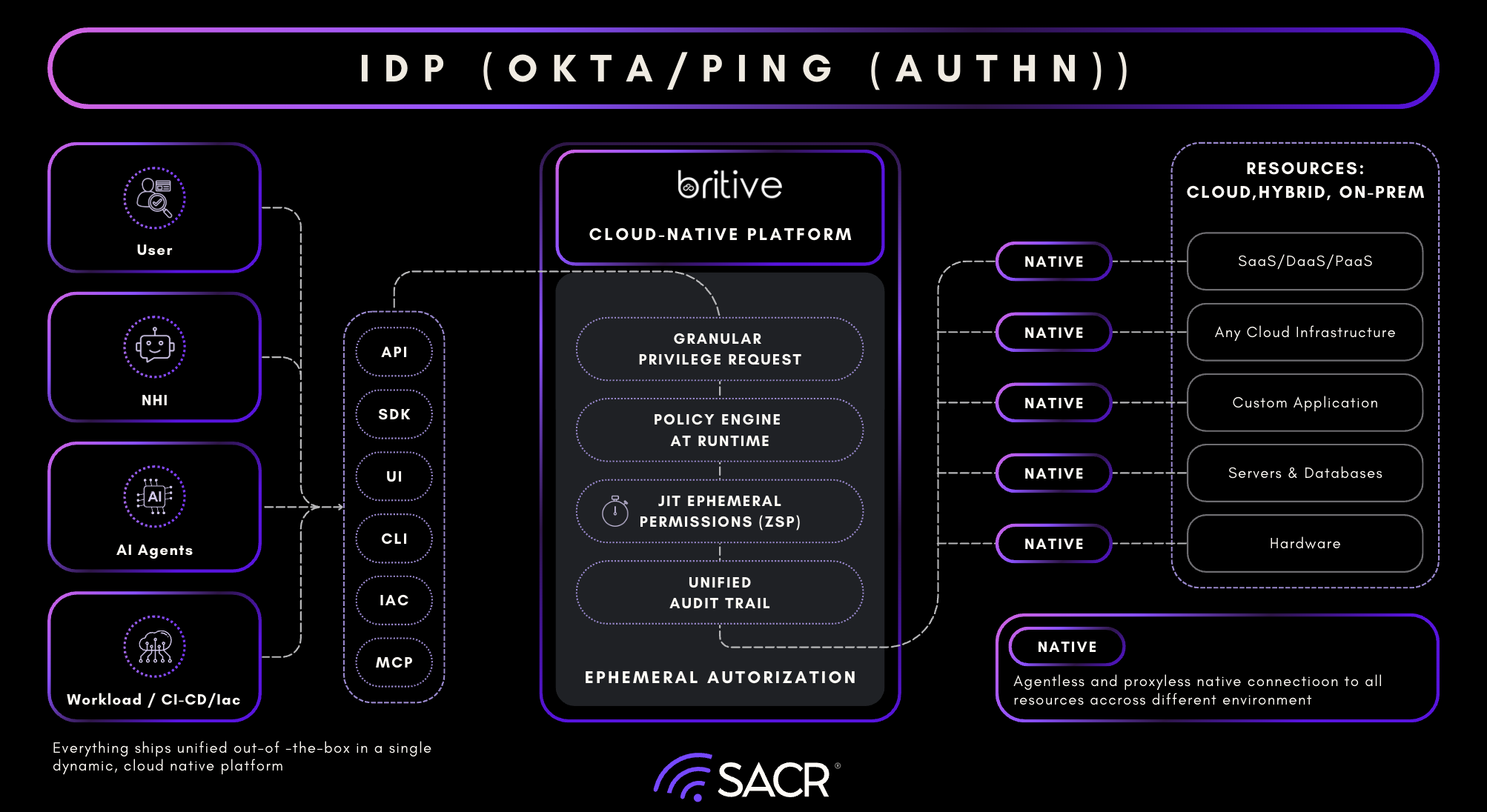 A core architectural pillar of the Britive platform is its Common Policy Model, which establishes a consistent security control layer across heterogeneous cloud, SaaS, and on-premises environments. By abstracting platform-specific entitlements, such as those found in Snowflake, SQL Server, or Active Directory, into a single framework, the platform allows teams to define fine-grained policies once and enforce them universally. This model applies the same Just-in-Time (JIT) and ZSP rigor to non-human identities as it does to human users, an essential capability given that machine identities often outnumber human identities by a factor of 40 to 50. To bridge the gap with legacy systems, Britive utilizes access broker technology to extend modern API-driven privilege controls into traditional on-premises infrastructure.