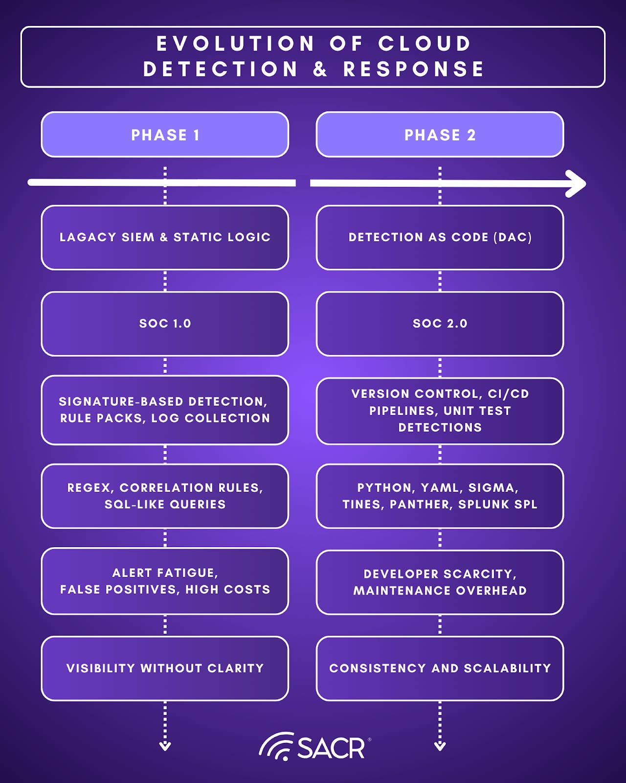 Phase 2 applied software discipline to detections, versioned logic, peer review, and testing. Detection as Code (DaC) improved quality, and speed versus static vendor packs. DaC struggles at scale, portfolios accumulate lifecycle debt as environments, telemetry, and attacker tradecraft drift faster than teams can continuously tune and validate content. DaC improved governance but did not eliminate the human bottleneck in adjudication and maintenance.